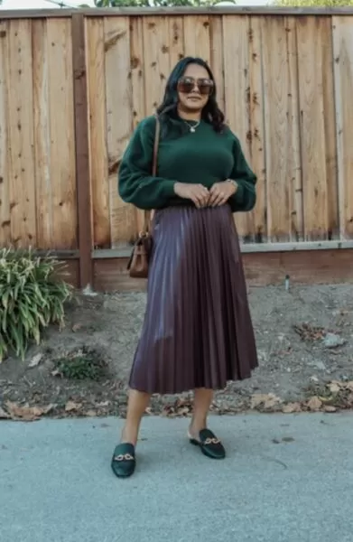 For a bolder and more statement-making style, pair a green knitted sweater with a midi maroon leather flared skirt. Complete the look with a brown shoulder bag and sunglasses. You can also wear open sandals or heels for a look that is perfect for any event.