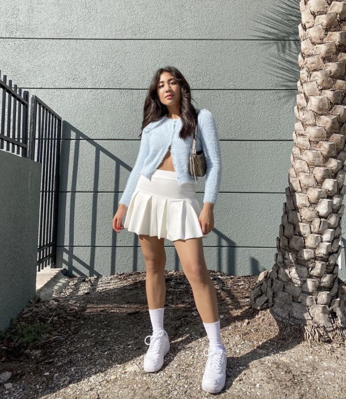 For a look that’s both fresh and modern, try a white mini flare skirt with a light sky blue colored sweater. Keep it elegant with some pearl earrings and nude pink lipstick to complete the look.