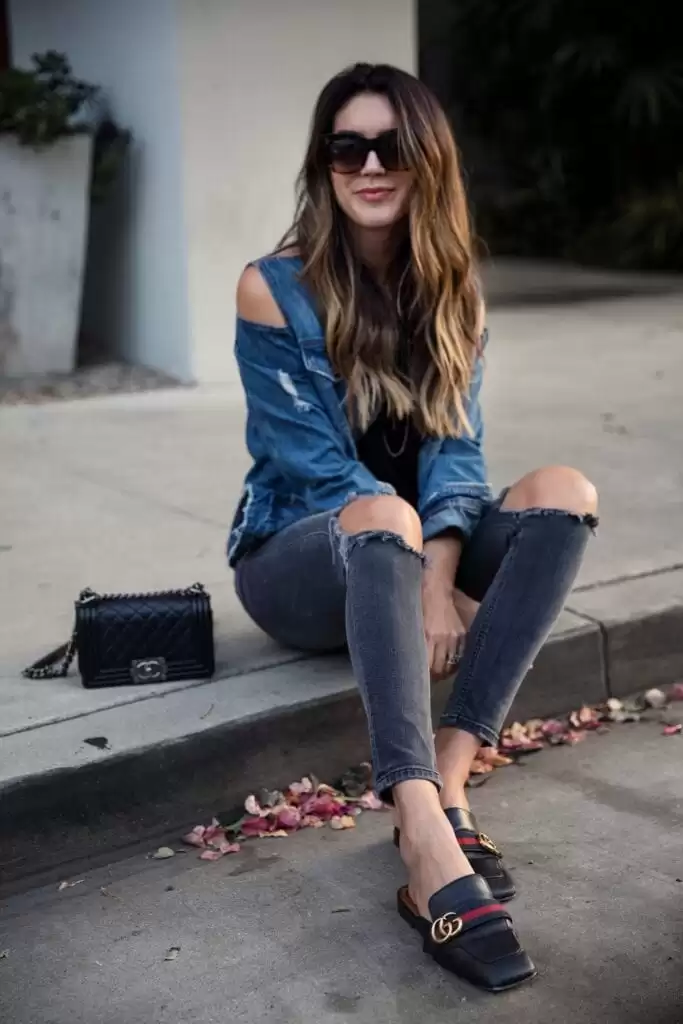 Gucci black leather loafers and a double denim outfit look lovely on any young girl during mid-summer. Also, a Gucci chain strap sling bag will make you slay the entire ensemble. This is a great look for a girl’s day out!