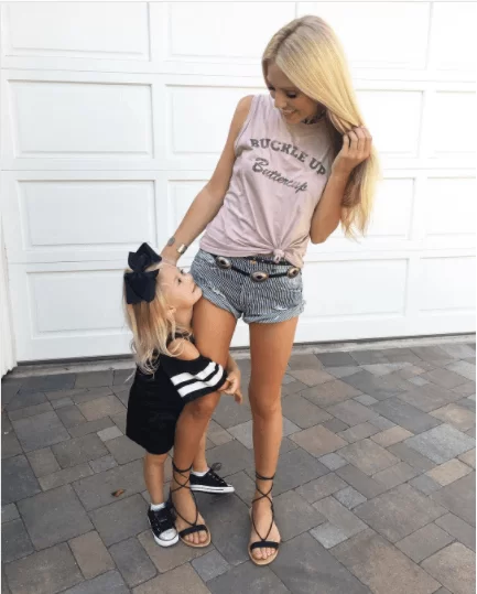 Being a super stylish mommy like Savannah LaBrant, you can slay some gorgeous black thong sandals with thin straps to tie around your ankles with a casual high round neck tee and blue denim stripey shorts with an embellished ethnic belt to add beauty to the entire combo. Do check out these 40 Ways to Style Floral Shorts.