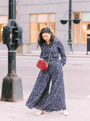 We love this dressy ensemble that you can rock for many different events. Not only will you feel super comfortable in this wide-legged jumpsuit, but you will also feel like the best fashionista with this stylish bag and a pair of slingback mules.