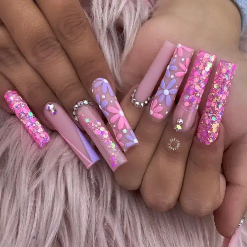 You can use flower-shaped glitter on your nails for the purpose of nail art. Sprinkle a bunch of glittery flowers on the cuticles and paint with your favorite base color.