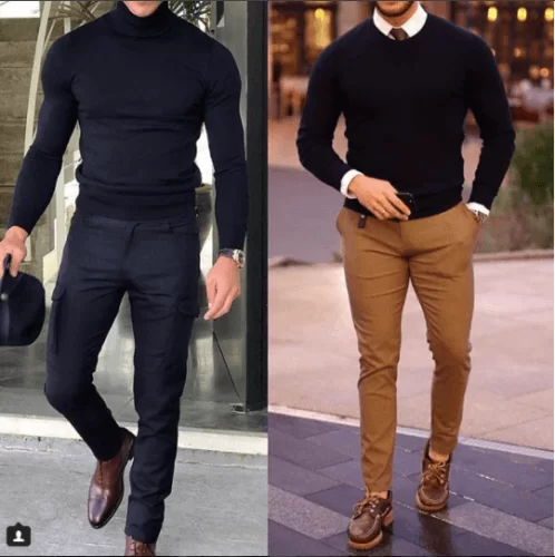 Turtleneck sweaters and knitted tops can be turned into a formal staple during winters with a trench coat over it and formal cotton pants. To make it look more professional, oxford shoes are a superb option as these can make nearly semi-formal attires look formal.