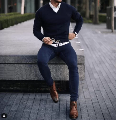 Suits are not the only option when you are going to dress formally. You can also go for dark knitted sweaters over white crisp collar shirts and dark color pants. However, you should always opt for simple black or any formal color shoes to keep it professional.