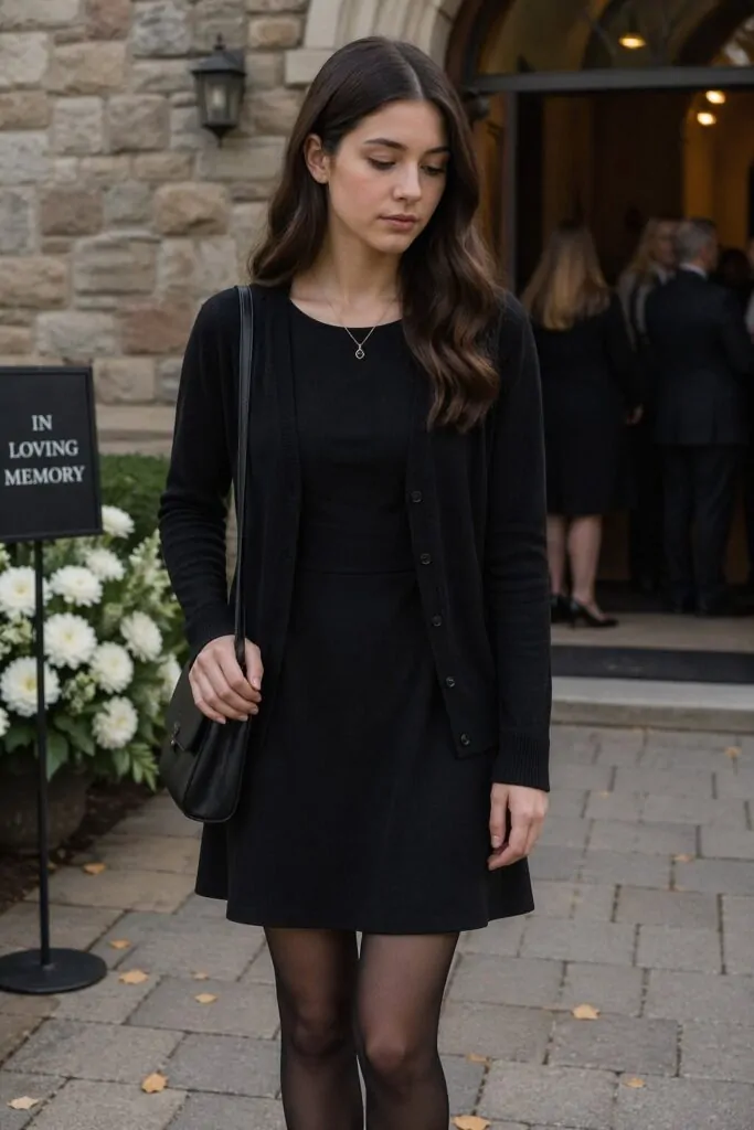 ***The black dress remains the most foolproof choice for teenage girls at funerals.*** Choose a simple A-line or sheath style that hits below the knee. Add a cardigan or blazer for coverage and bring comfortable flats or low heels. This combination works for any type of service and can be dressed up or down based on accessories.