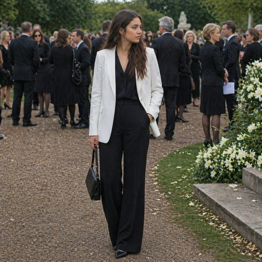 All-white can work for funerals in certain cultures, and this flowing ensemble shows how to do it respectfully. The loose-fitting blazer and wide-leg trousers create an understated, modest look that’s comfortable for long services. The minimal styling keeps the focus appropriate rather than attention-grabbing.