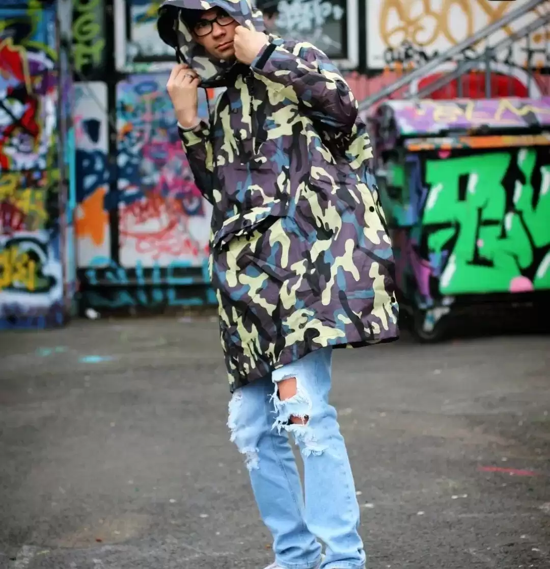 21 – Camouflage Pattern Rain Jacket with Ripped Jeans