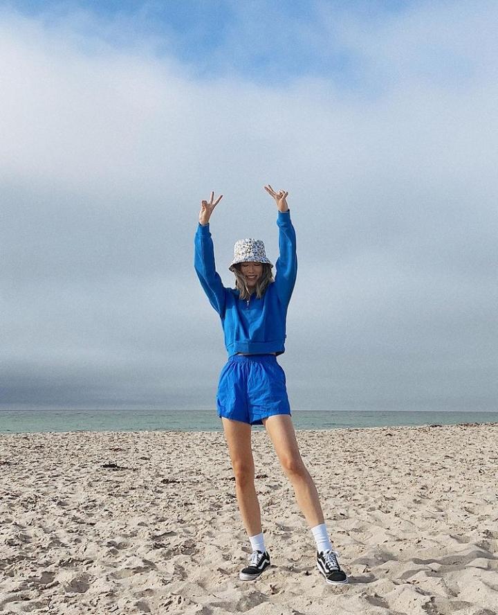 If you are going to a beach and you need something to wear over your bikini. For this purpose, nothing is better than a bright blue sweater plus a shorts outfit. Wear sneakers if you want to save your feet from dust. This look is preferable for the after swim outfit. Lastly, finish off the look with a sunshine smile and a pose for the picture.