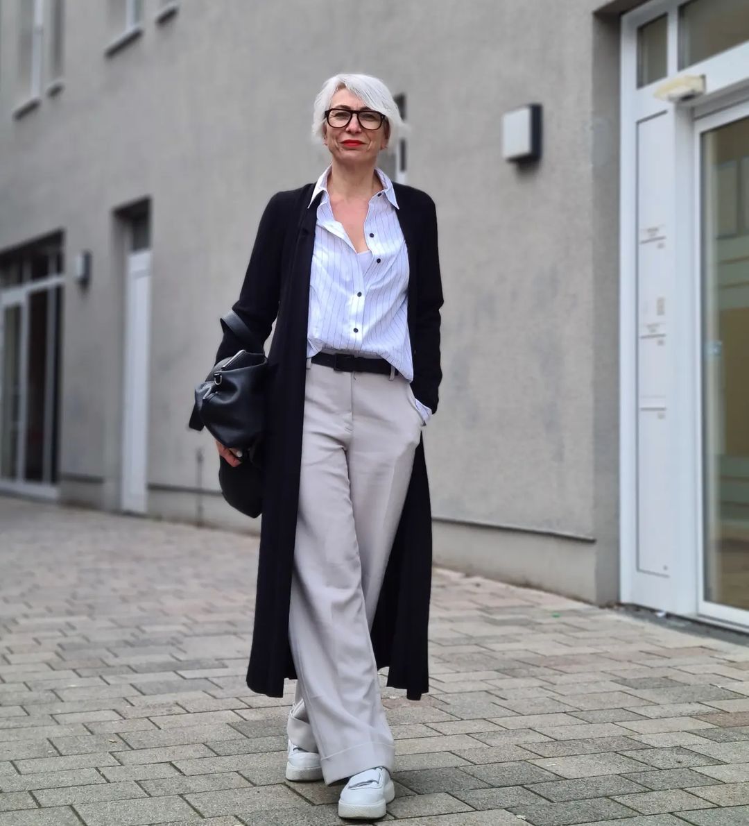 A cool way to tone down your professional look is to replace your blazer with a long cardigan. For a business casual look, pair it with dress pants and button-down shirts. Invest in neutral cardigans in beige, black, or grey instead of wearing loud colors and patterns for workwear.