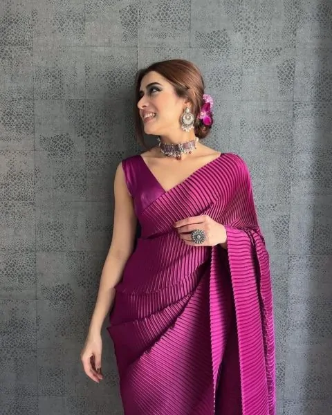 You can play with the fabric easily when you are going with a plain saree without borders. You can definitely take some inspiration from this look. Pleated detailing helps the saree to look classy. You can pair this saree with a matching sleeveless blouse and accessorize it with a chunky silver bracelet and blingy earrings to give a formal vibe to the entire look. Let your hair down to make the look stand out.