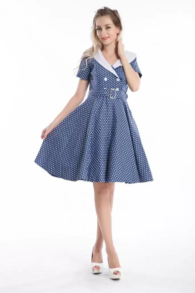 Swing dress belongs to the dancing and the fun-loving era of the 40s, the dance halls in the 40s saw girls who wanted to be liberated and danced their way through life. Basically this brought on the waist fitted and leg-showing ballooning dress which moved with the dancing girls beautifully showing their figures.