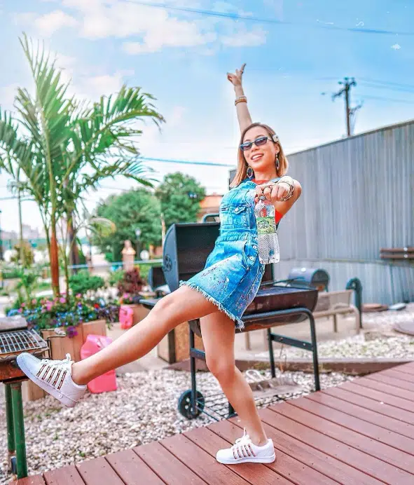 If you are indecisive about what to wear to your college tailgate party then you can surely recreate this look. In this outfit inspiration, we have styled blue denim overalls with a mustard sleeveless vest top. Moreover, style your hair casually with a P-cap to compliment the entire look. Moreover, wear a stylish pair of sunglasses and a few suitable accessories to enhance the look more. Lastly, wear a pair of white sneakers to complete the entire look.