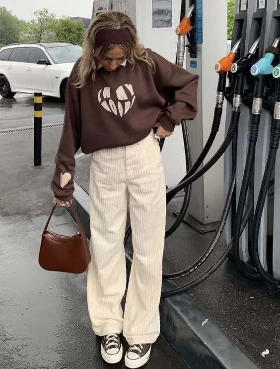 Corduroy pants and headbands? Yes, please! I love this look’s cream and brown palette – cool and super trendy!