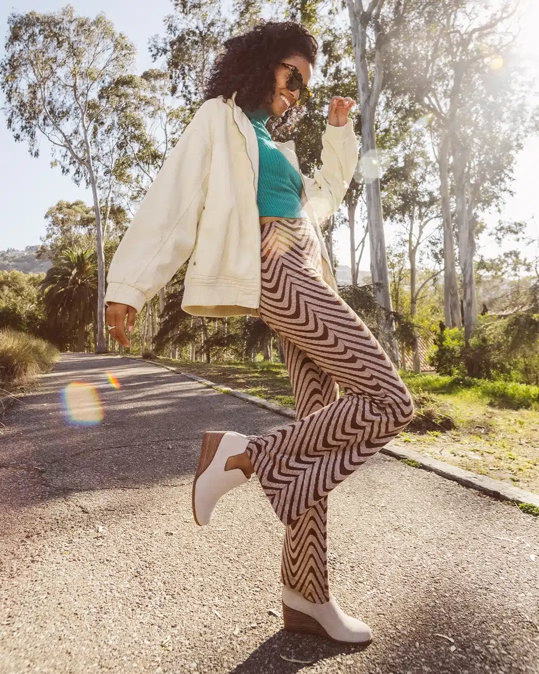 Pick up your favorite turtleneck blouse, along with that pair of bell bottoms or flare pants that have been kept in the closet for so long. To make it fitter for the weather, you can also layer your outfit up with a white jacket.