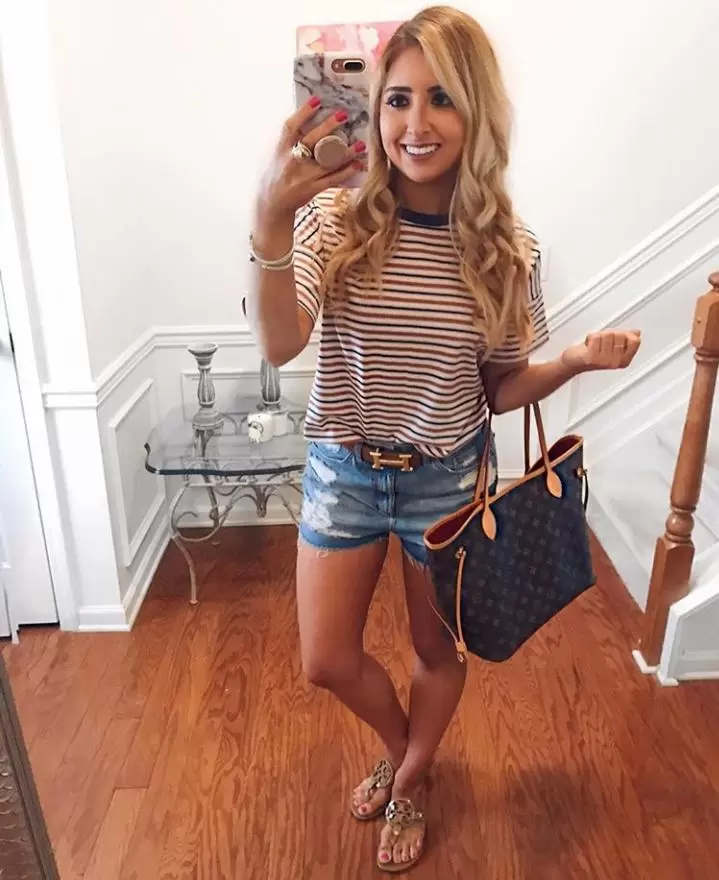 Stripes and shorts can also be a great back-to-school outfit for high school girls. The addition of a tote bag and some sandals seem to be doing the job here. You’ll love these 10 Ways to Wear Striped Shirts.