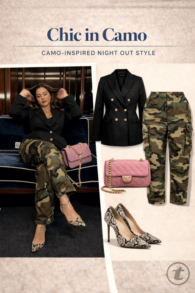 The camouflage pants and oversized blazer look phenomenal paired together but exude more masculine vibes. Thus, to make it more feminine and true to your taste, add a bubblegum pink purse and sparkly heels. It would contrast well with the clothes and help create a very balanced look!