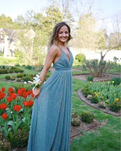 Everyone will be drolling over you if you make your entry to prom in this sparkly maxi outfit that has delicate straps, plunging neckline, and a cinched waistline. Add loose curls to your hair and accessorize with chunky earrings, dainty necklace, and floral bracelet. Don’t forget to wear heels with this outfit as they will give your maxi some height making it appear even more captivating.