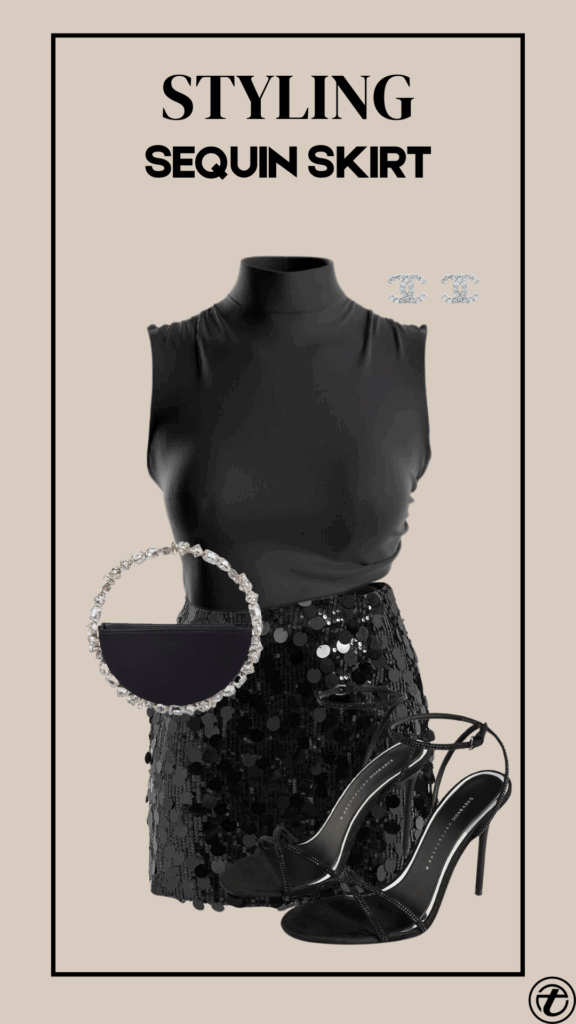 As you have already chosen to wear a black skirt, it is only reasonable that you don’t stop there, and wear it with a matching black sequin top. However, it is important to keep the outfit classic with the cut of the top and skirt, making sure they are plain to compromise for the glamorous finish of the skirt and top.