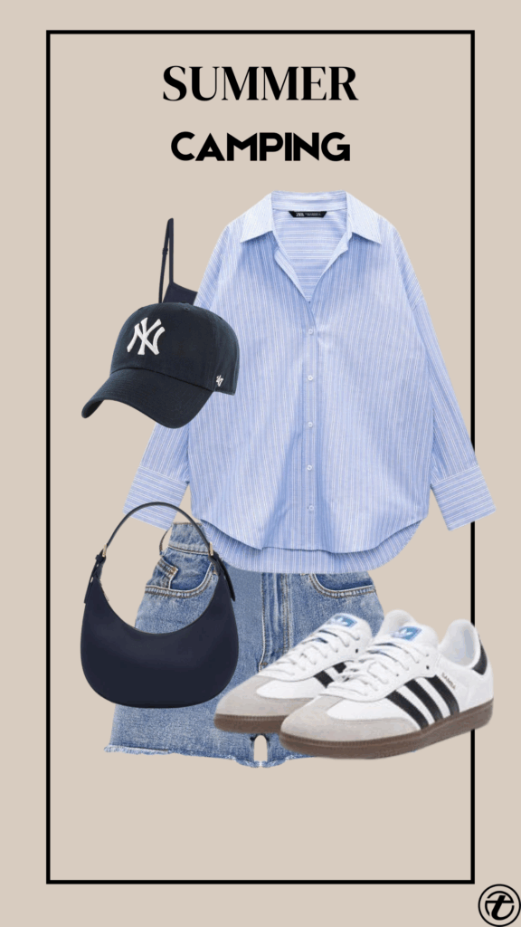 Polka dots are a cute way to switch up your outfit. You can pair a casual t-shirt with a polka dot skirt to make your outfit look cuter. This outfit is super simple and easy to put together. It would be perfect for camping as it won’t take long to put together either. You can wear it with sneakers, sandals, or boots. Pair this look with a baseball cap and it’ll be the perfect mix of sporty and stylish.