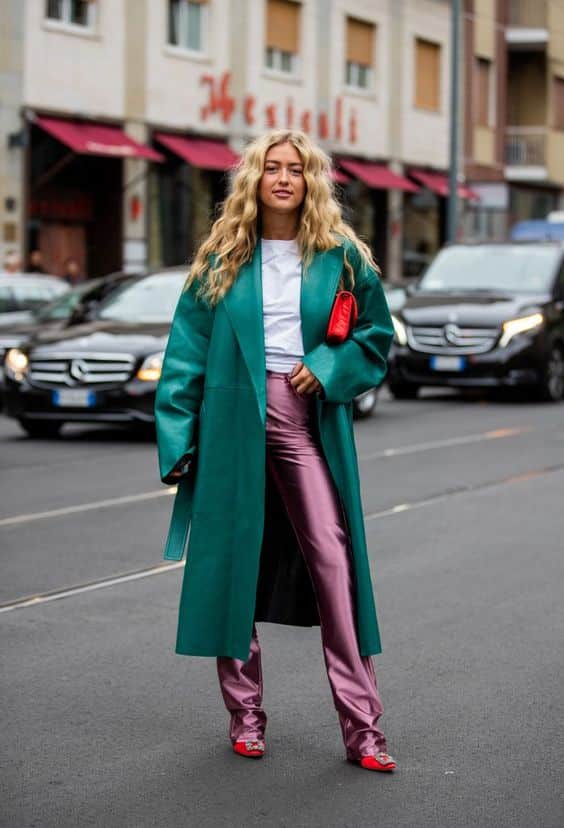 Teal is fun and so should its outfits be. You don’t always have to wear an outfit that’s teal from head to toe. You can subtly wear teal too. Just like this one, the woman is wearing a teal overcoat with purple pants and a white shirt. It’s not about what you wear but how you style what you wear.
