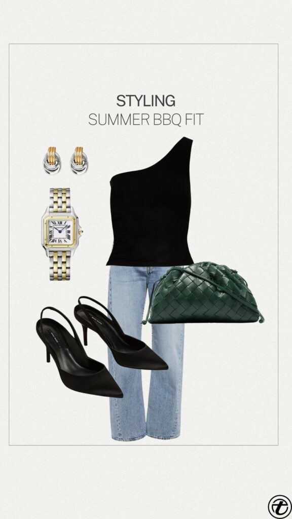 A one-shoulder silhouette feels special without being overdressed, while the asymmetrical neckline photographs beautifully for social media moments. Light wash jeans balance the dramatic top and hide grass stains better than white or cream. The pointed-toe slingbacks add sophistication — choose a low heel for outdoor comfort.