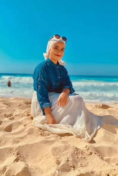 If you are a fan of modest fashion and looking for an outfit that is trendy at the same time, then this is the look for you. You can wear a blue button-down cuffed shirt with a white skirt and headscarf to pull off a cool summer beach look. Moreover, you can wear your favourite beach sleepers and a pair of sunglasses to complete this look.