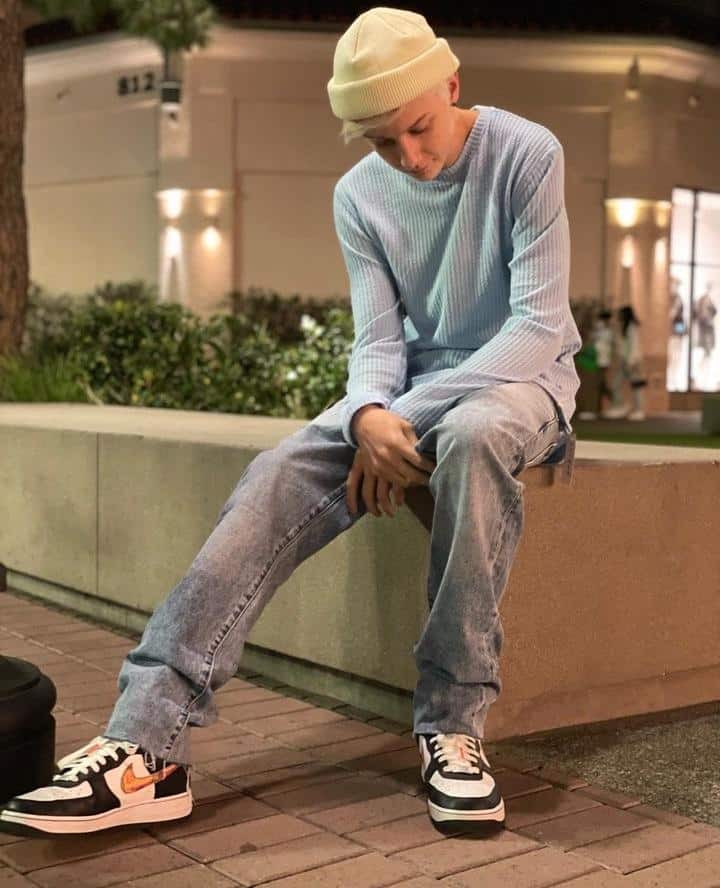 You can create a fancy night out look with a light blue ribbed shirt with straight long denim pants. Add a yellow beanie to finish in style. Pair it with black and white Nike shoes. You can add a black leather jacket with this look if it’s too cold for outside.