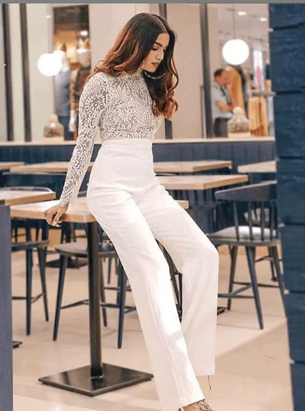 If you think the monochromatic look is too boring or old school for you, you have another thing coming. It is understated how a simple one colour scheme outfit can make you stand out in the crowd. Get your hands on fitted high-waisted pants which are the trendiest piece on the market and pair them up with a sheer lace blouse with a floral inner. Wear big silver loopy earrings and white minimalist heels for a refined appearance.