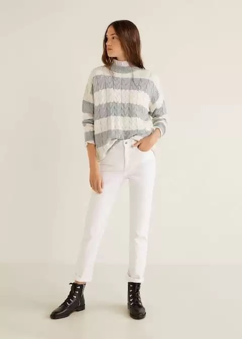 Get yourself a striped sweater in white and baby blue colors for $39.9 only from Mango’s official site and pair it with any white pants you possess. The look is super cool for professional mommy’s who love to dress up all cozy during fall.