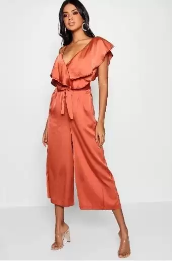 The luxurious satin wrap jumpsuit which has an asymmetric and fluttery neckline is perfect for ladies who are petite or lean. Get this dress from Boohoo.com for $25. Wear it with hoop earrings and lit stiletto heels in black for $20 from Boohoo.com. You can tie your hair in a sleek ponytail and flaunt your facial bones just like a VS model. The exact price of this combo will be $45. Here are 16 Cute Jumpsuits Outfits & Ideas on How to Wear Jumpsuits Rightly.